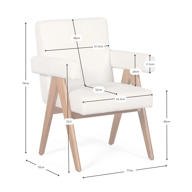 Sedia Compass con braccioli in legno di teak e tessuto bouclé